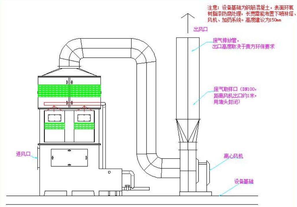 ◇填料噴淋塔為方形塔體,采用(304)不銹鋼板分段制作而成。 ◇吸附劑循環(huán)系統(tǒng)的循環(huán)水箱與塔體一體化制作,循環(huán)水泵安裝在循環(huán)水箱側(cè)面。 ◇噴淋段均采用螺旋噴嘴、空心多面球和有機玻璃檢視口。